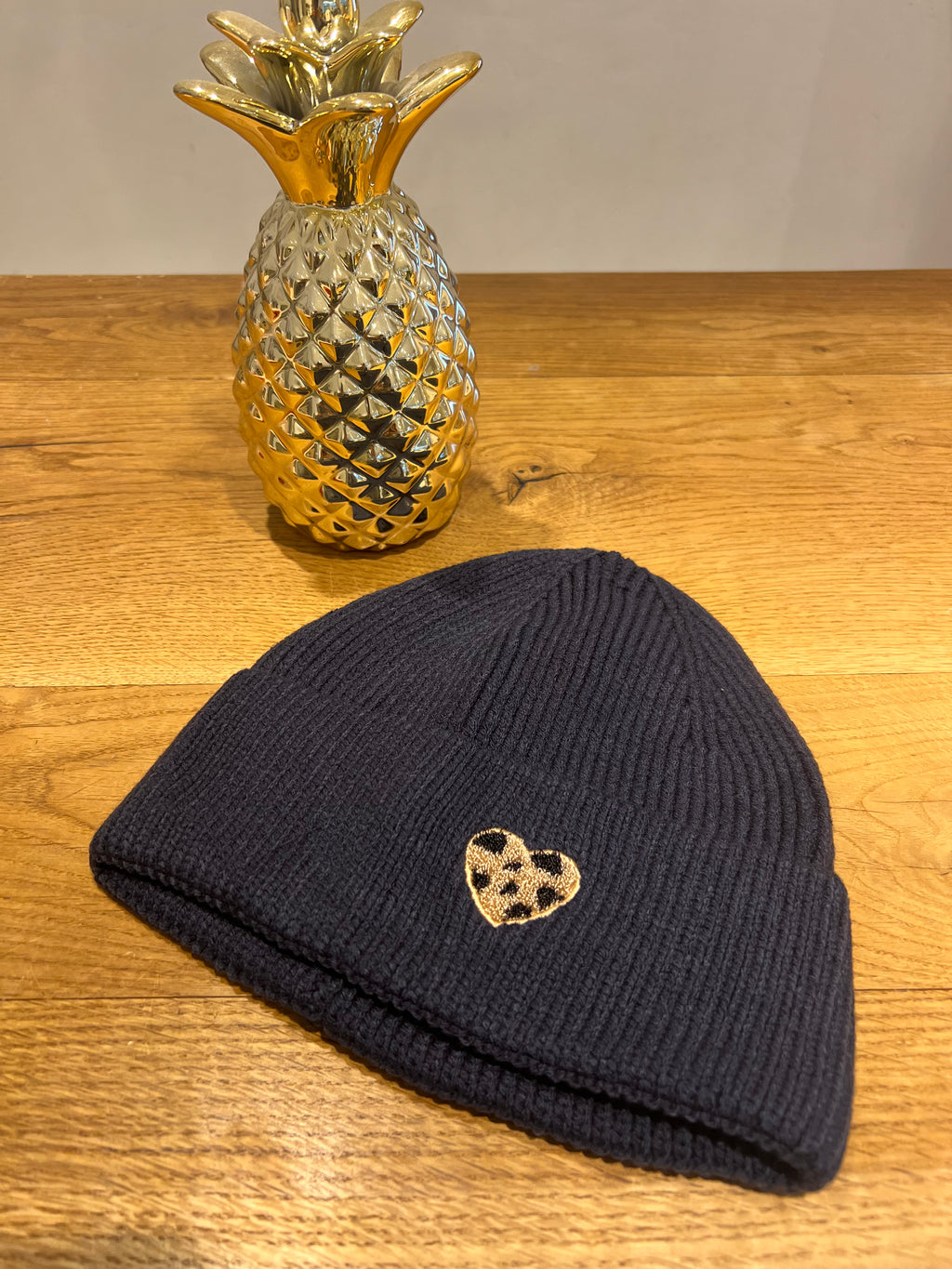 Weiche Strick Beanie mit gesticktem Herz mit Leomuster