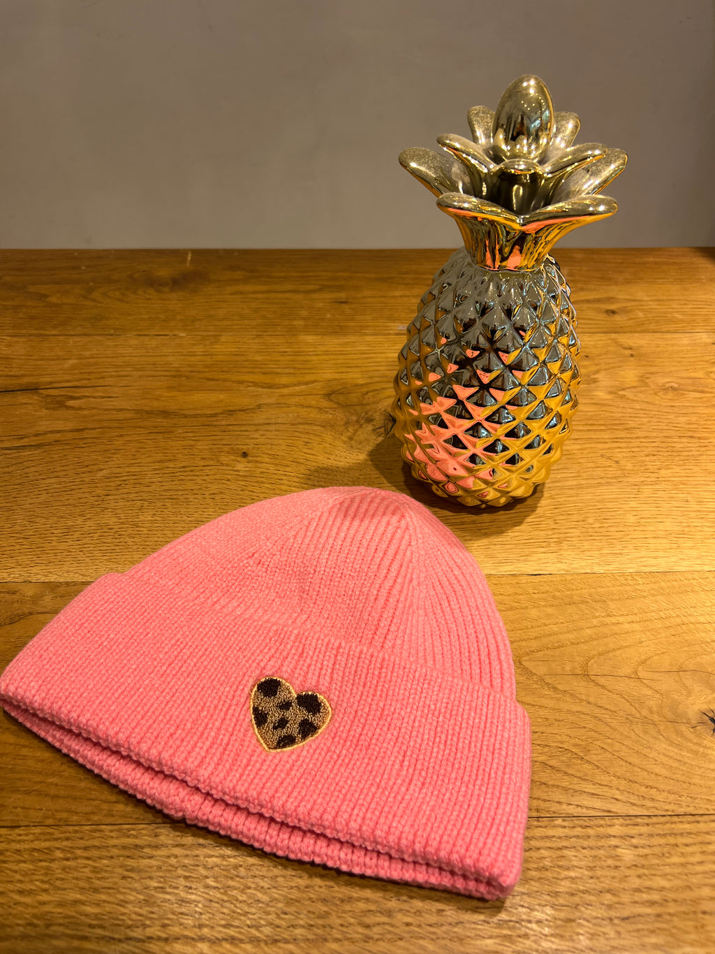 Weiche Strick Beanie mit gesticktem Herz mit Leomuster