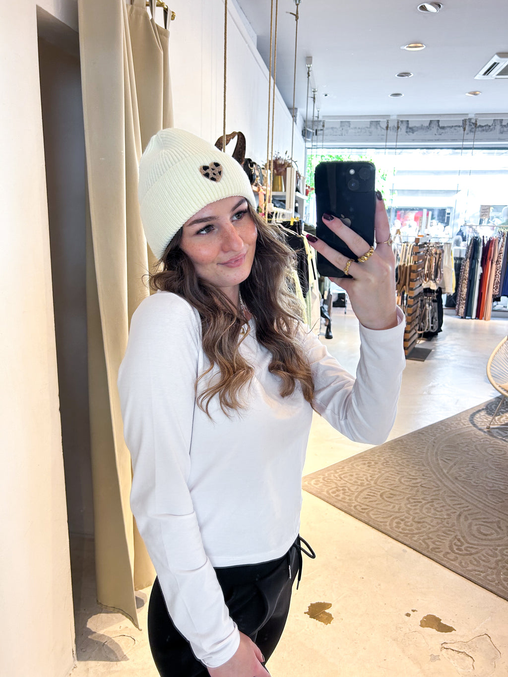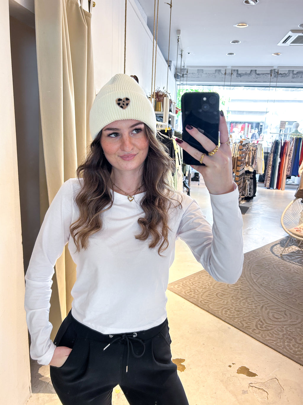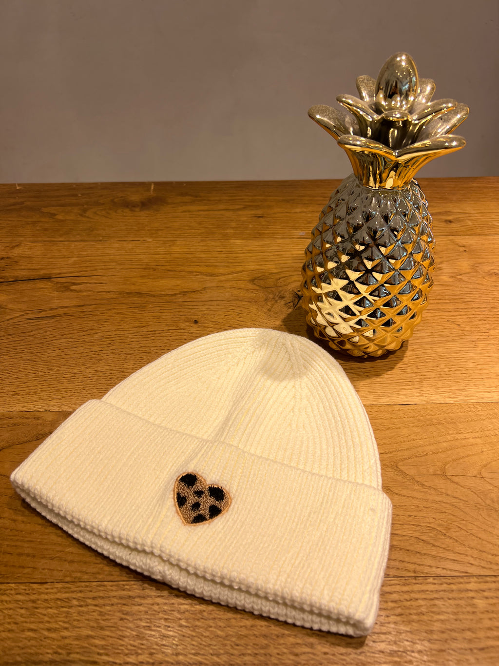 Weiche Strick Beanie mit gesticktem Herz mit Leomuster