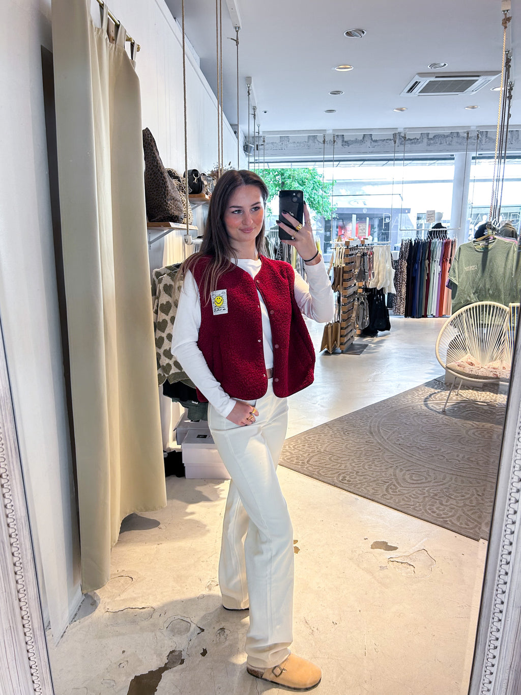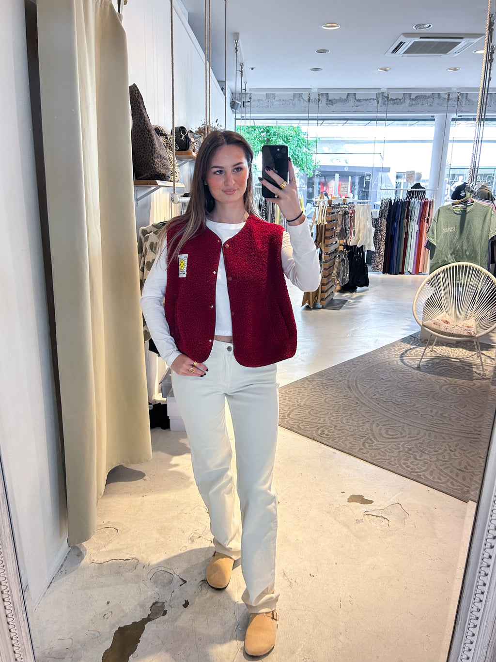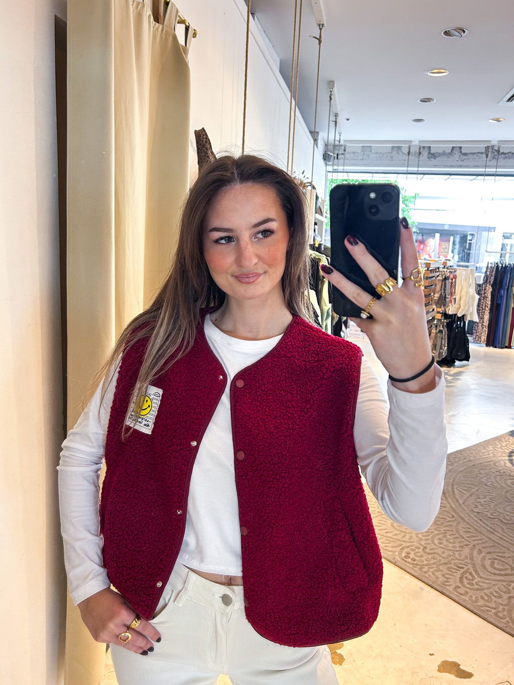 Kurze Teddy Weste mit Knopfleiste und Smiley Weinrot