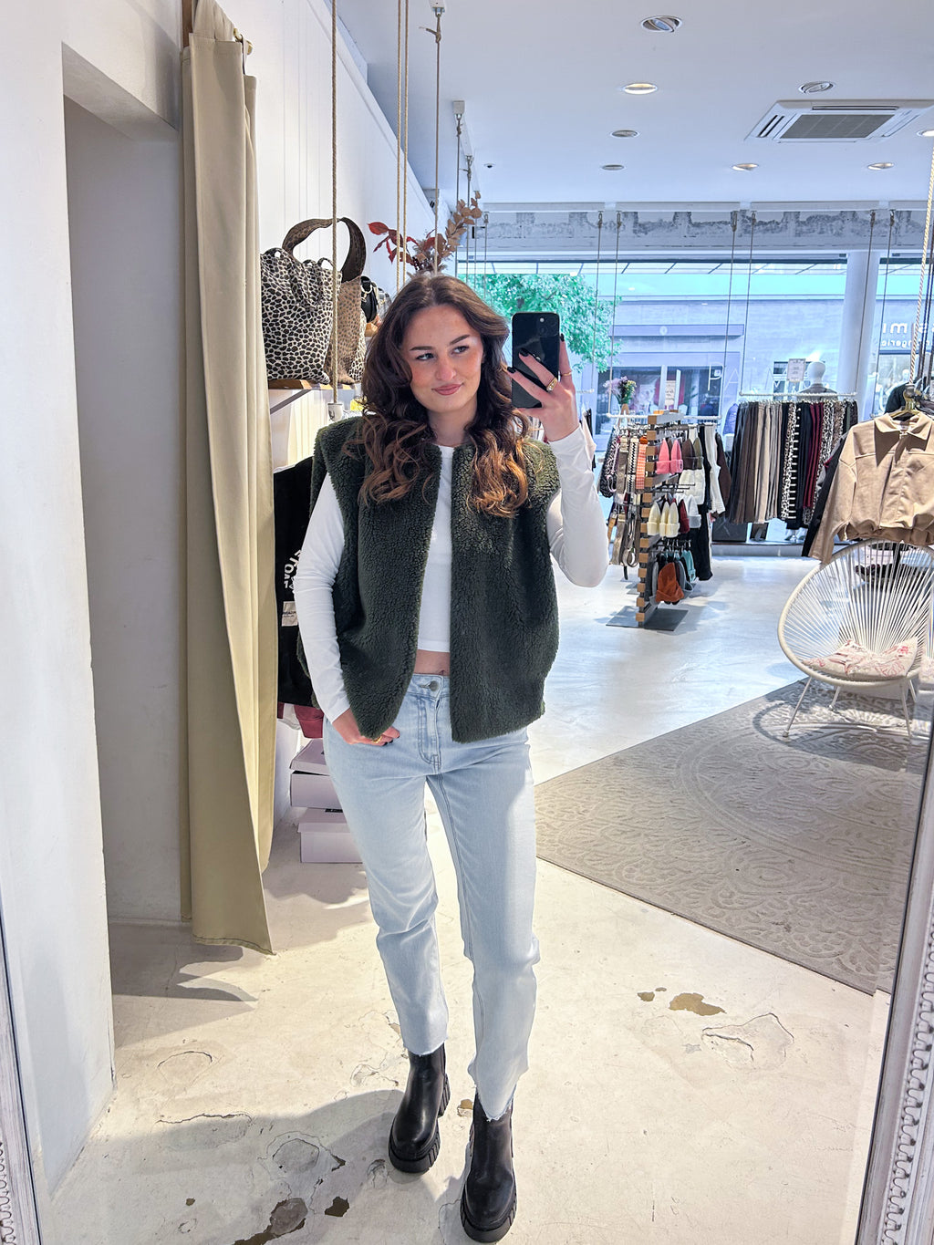 Die Teddy-Weste bringt weichen Teddy-Look und cozy Streetwear-Vibes zusammen. Mit relaxed Fit und offener Front ist sie vielseitig kombinierbar – das perfekte Layering-Piece für kühle Tage.