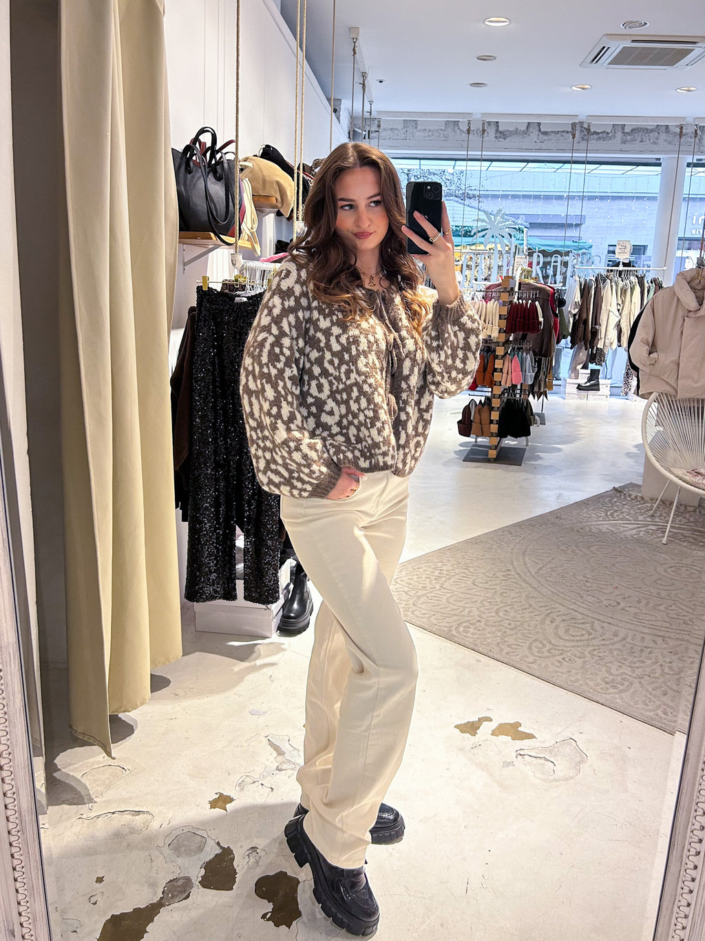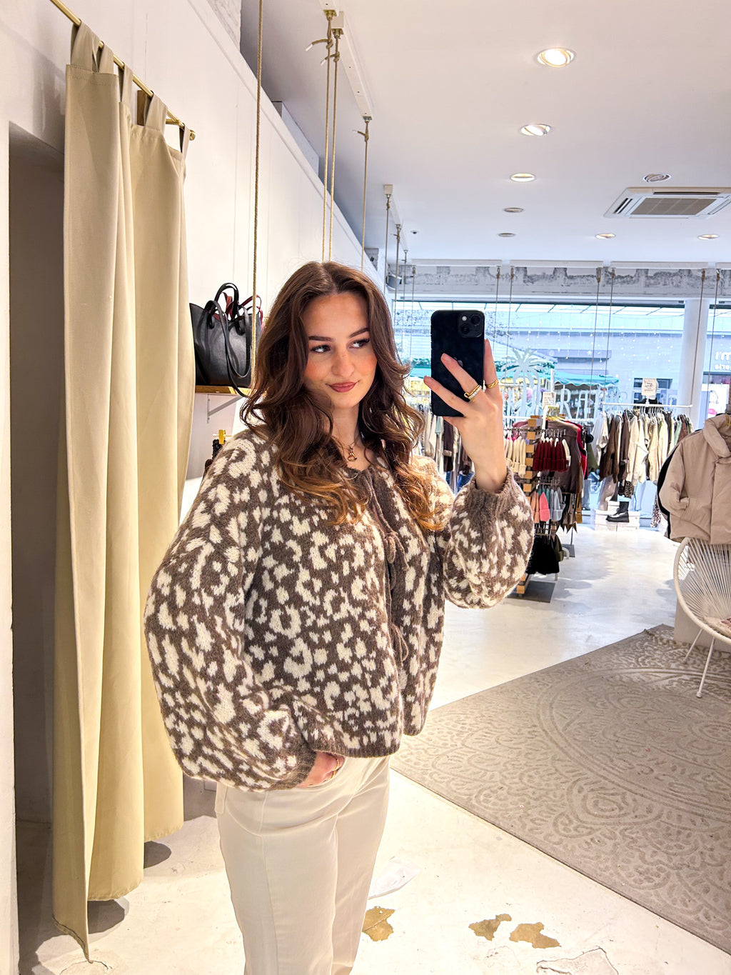 Kurze Oversized Strickjacke mit Schleifen und Leomuster Braun