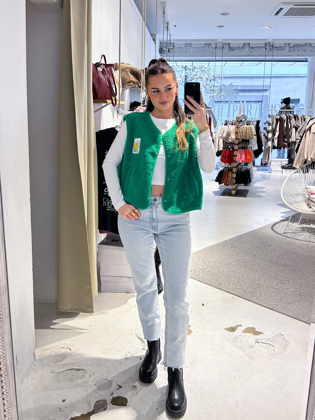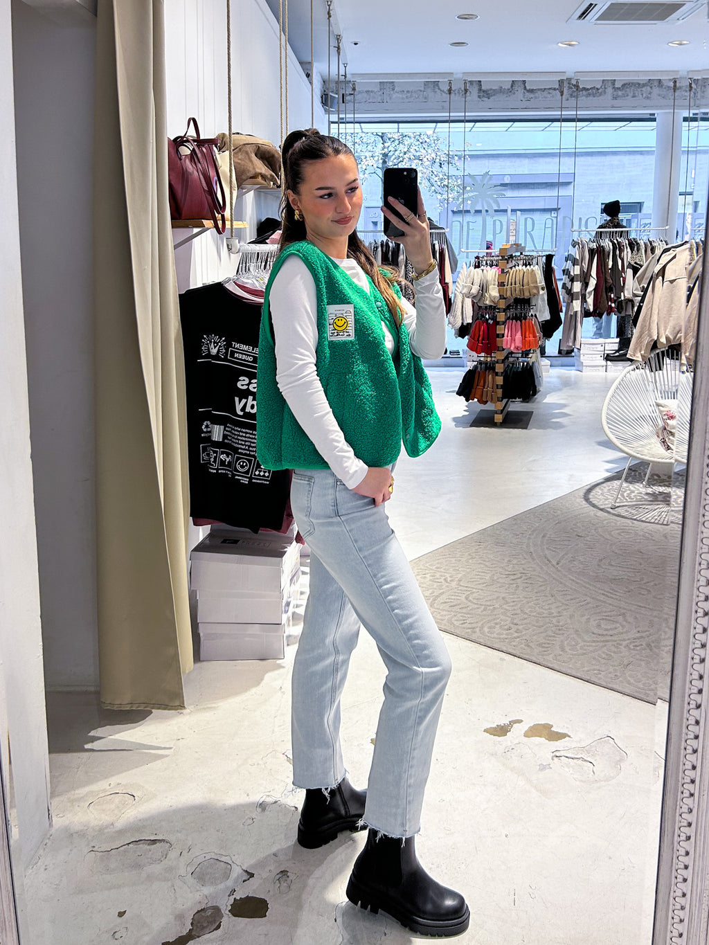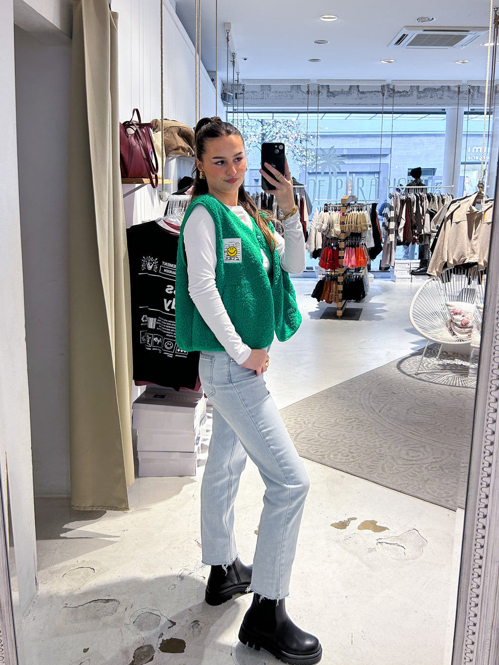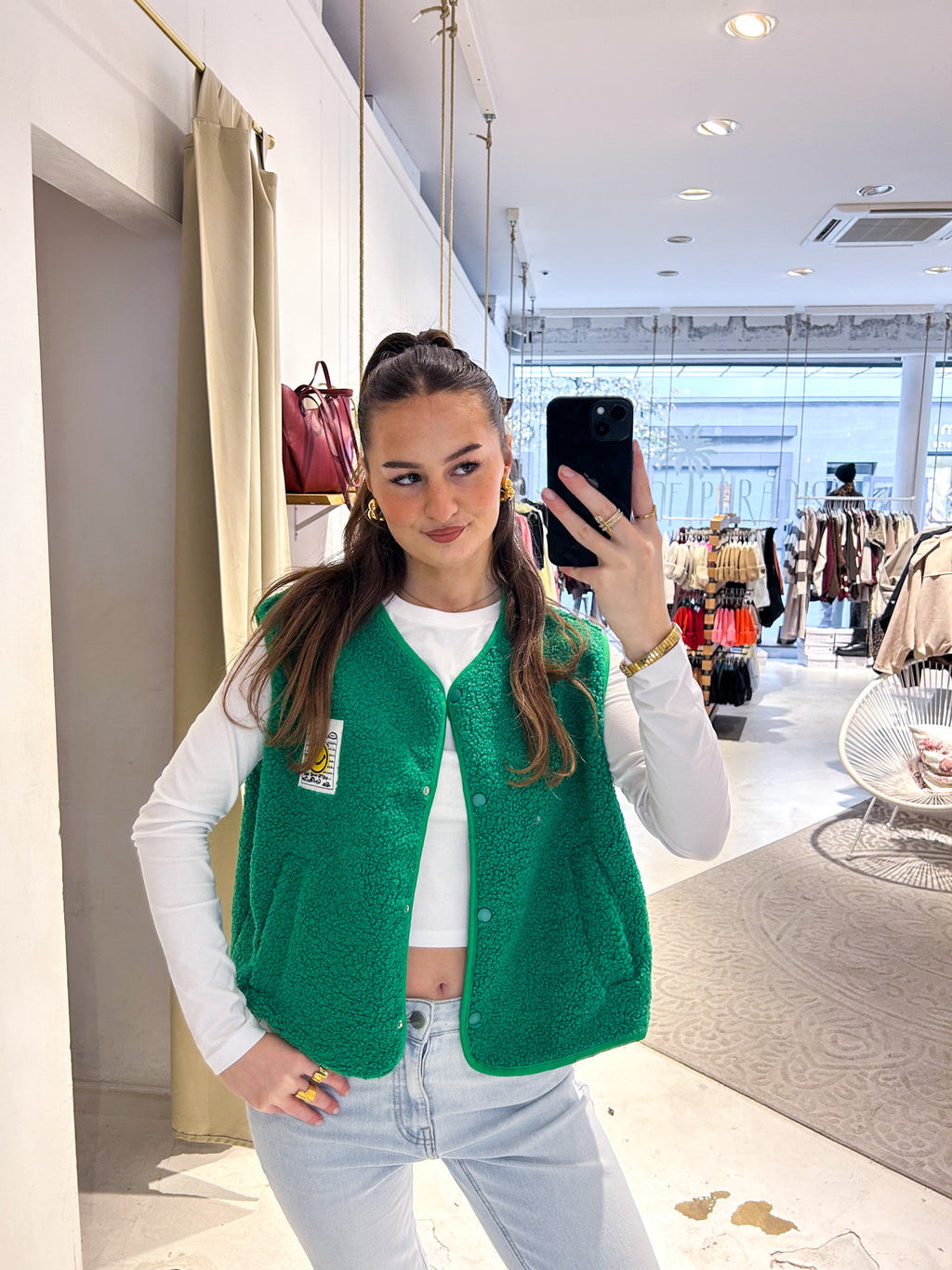Kurze Teddy Weste mit Knopfleiste und Smiley Grün