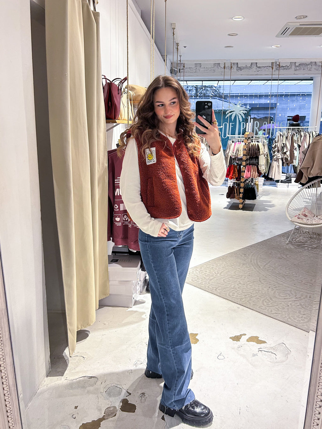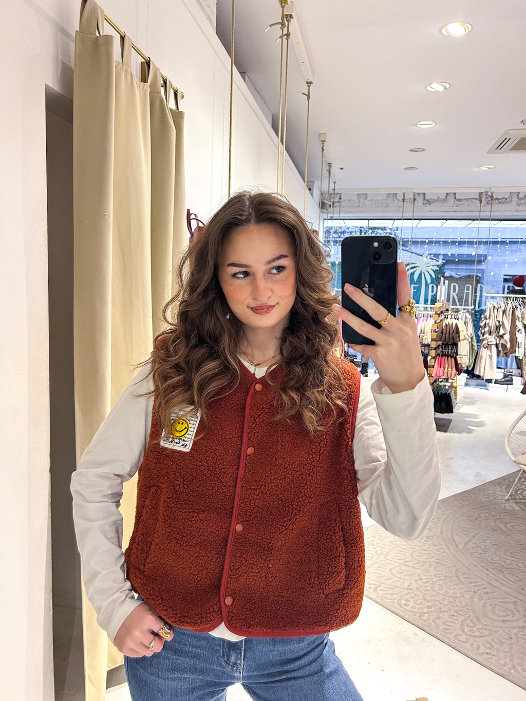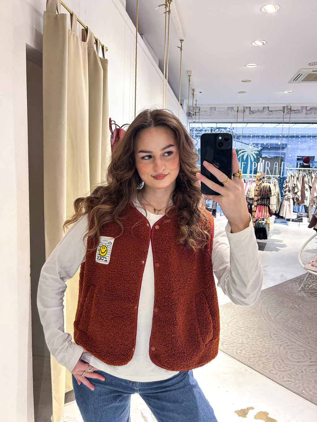 Kurze Teddy Weste mit Knopfleiste und Smiley Rost