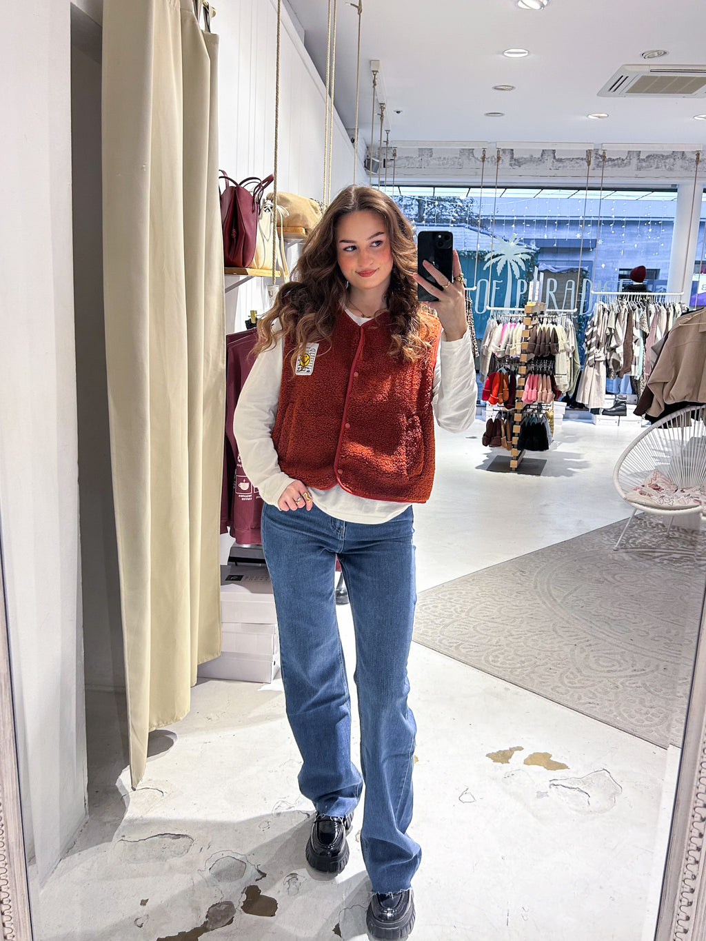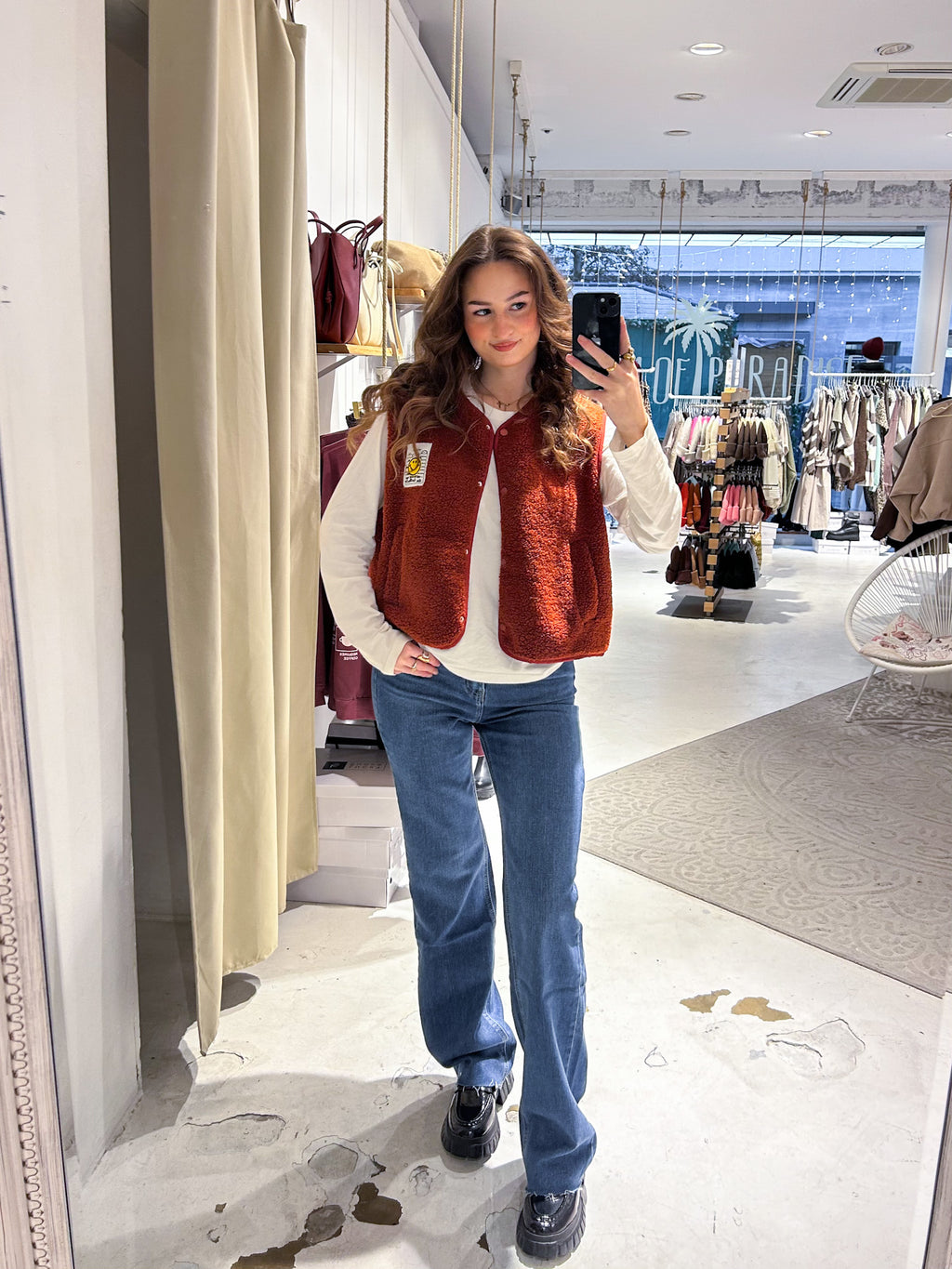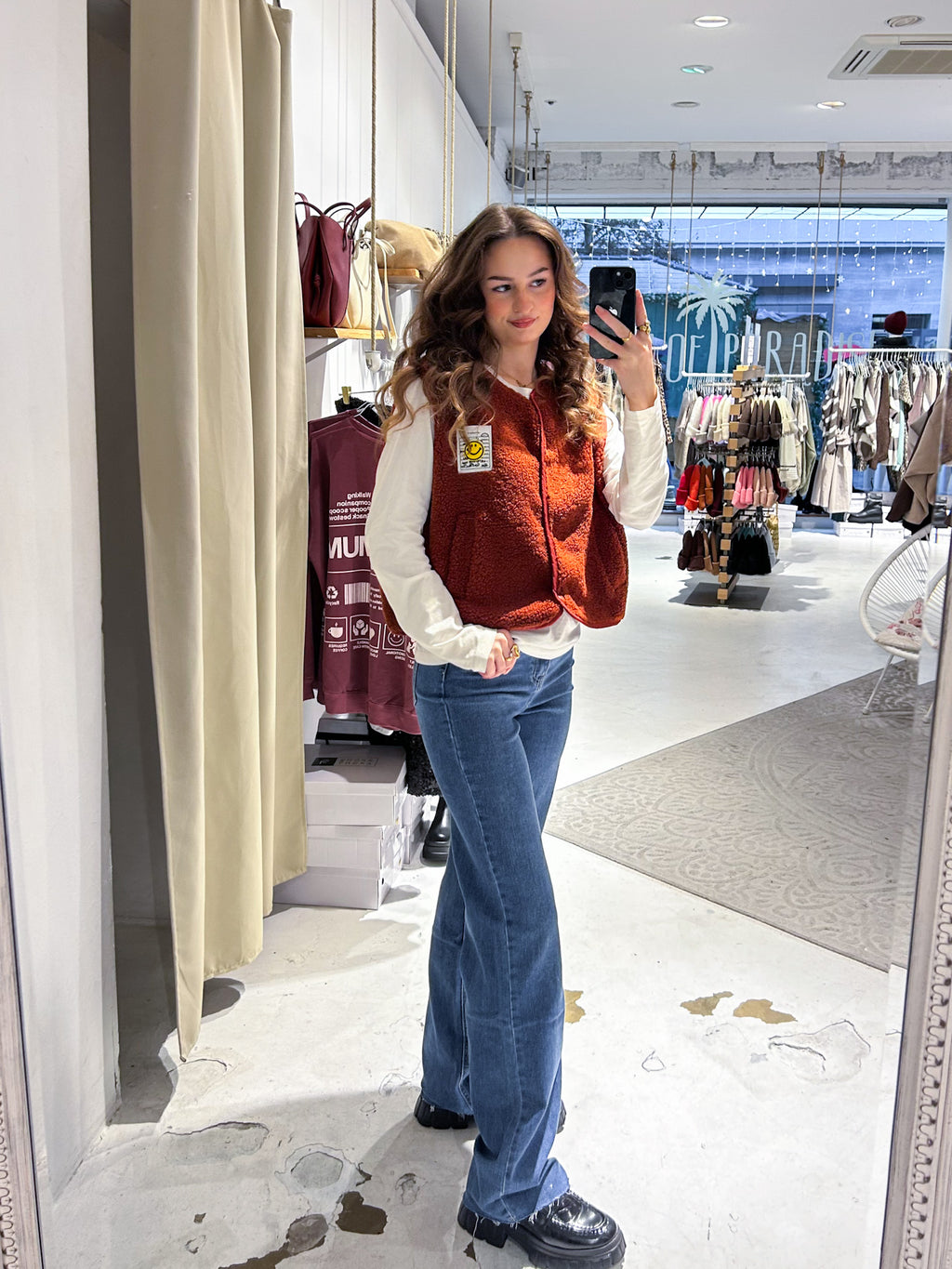 Kurze Teddy Weste mit Knopfleiste und Smiley Rost
