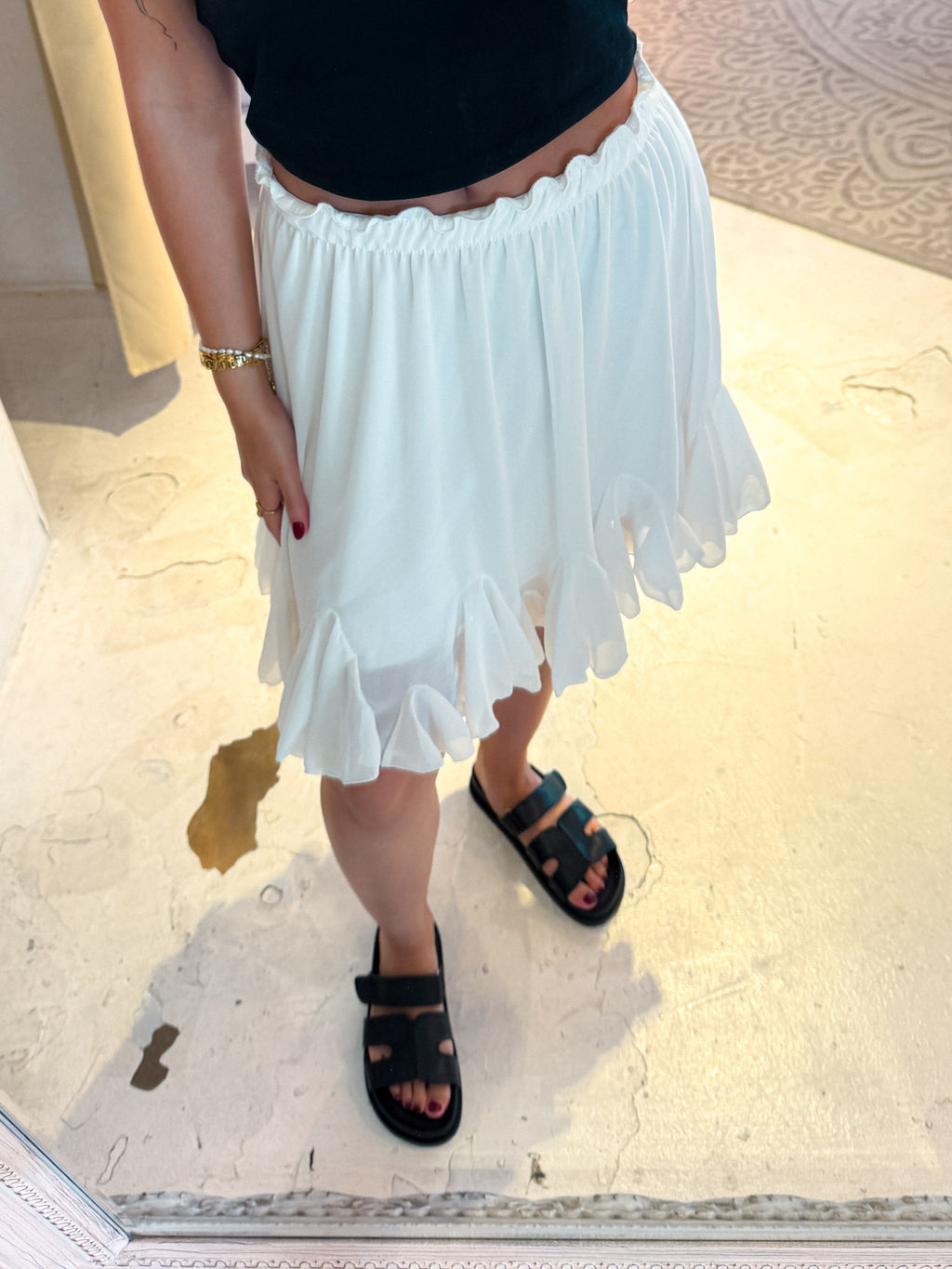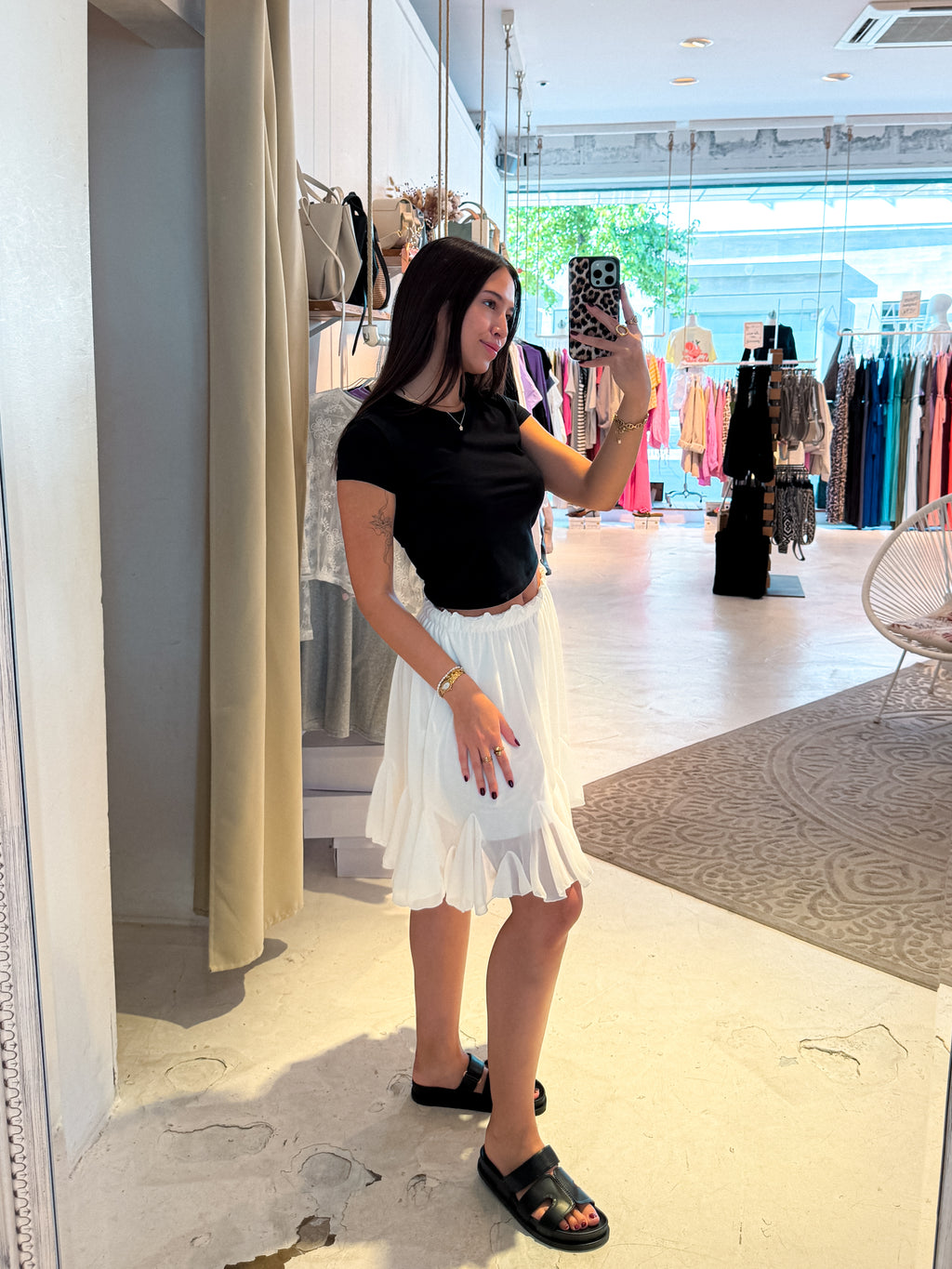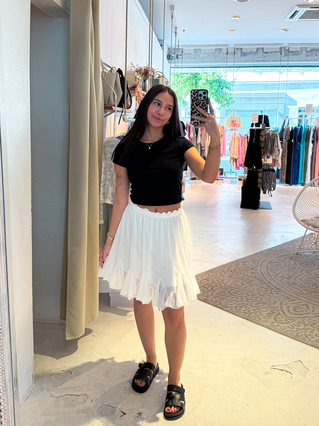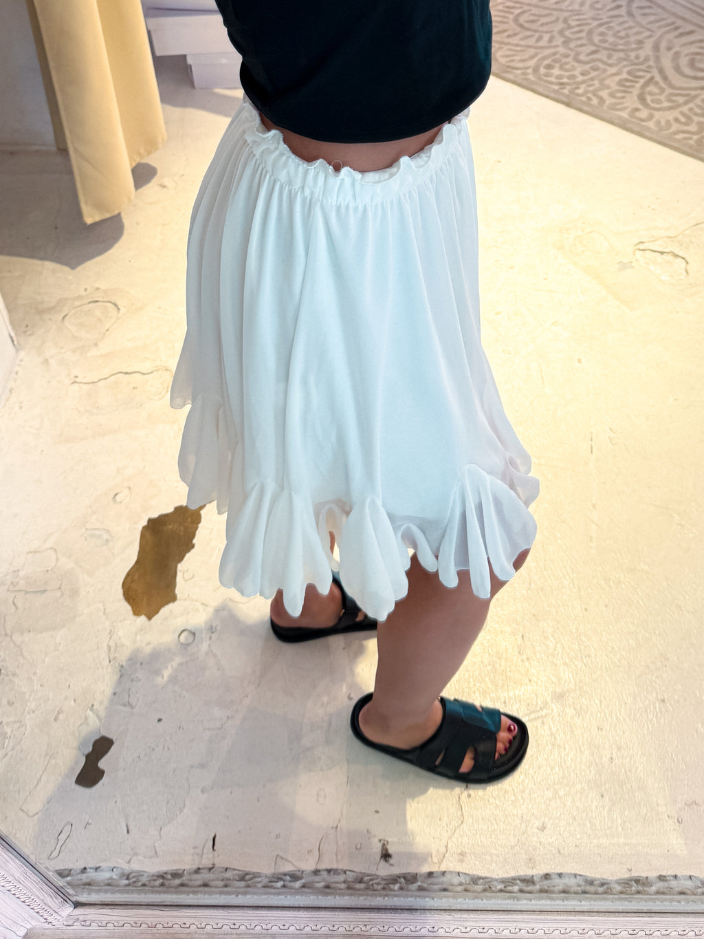 Ein trendiger Rock mit verspielten Rüschen, der allen Girls gut steht. Der dehnbare Bund macht ihn super bequem und passt sich perfekt deinen Körper an. Sei stylish und bequem unterwegs!
