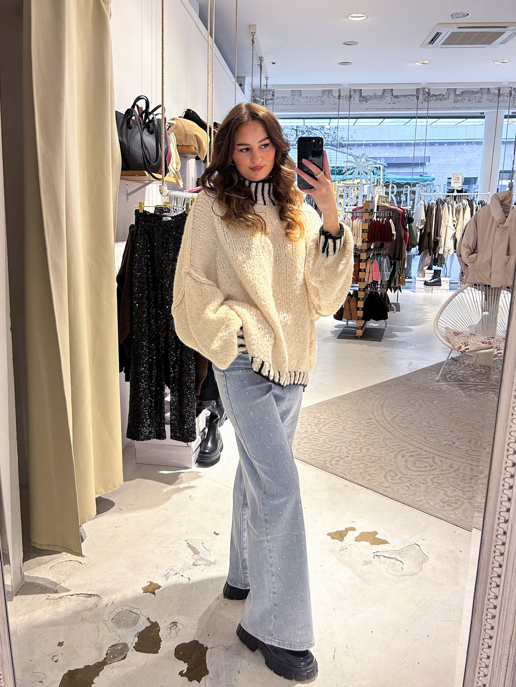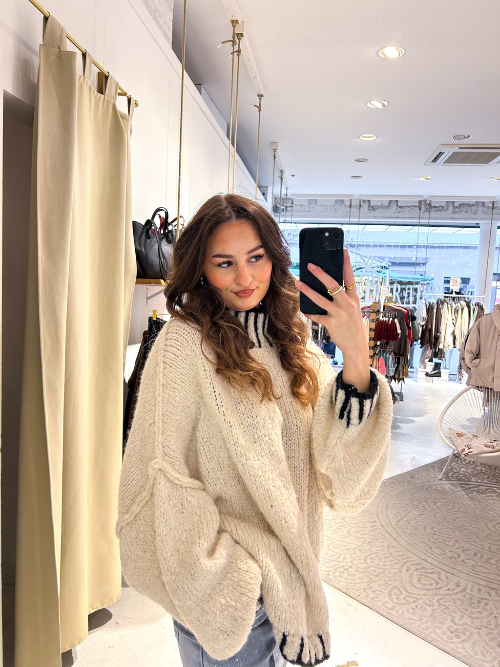 Oversized Strickpullover mit Stehkragen und farbigen Details Beige