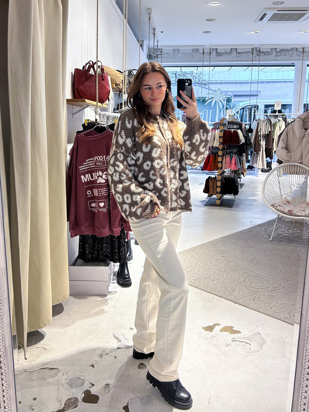 Kurze Oversized Strickjacke mit Leomuster Hellbraun