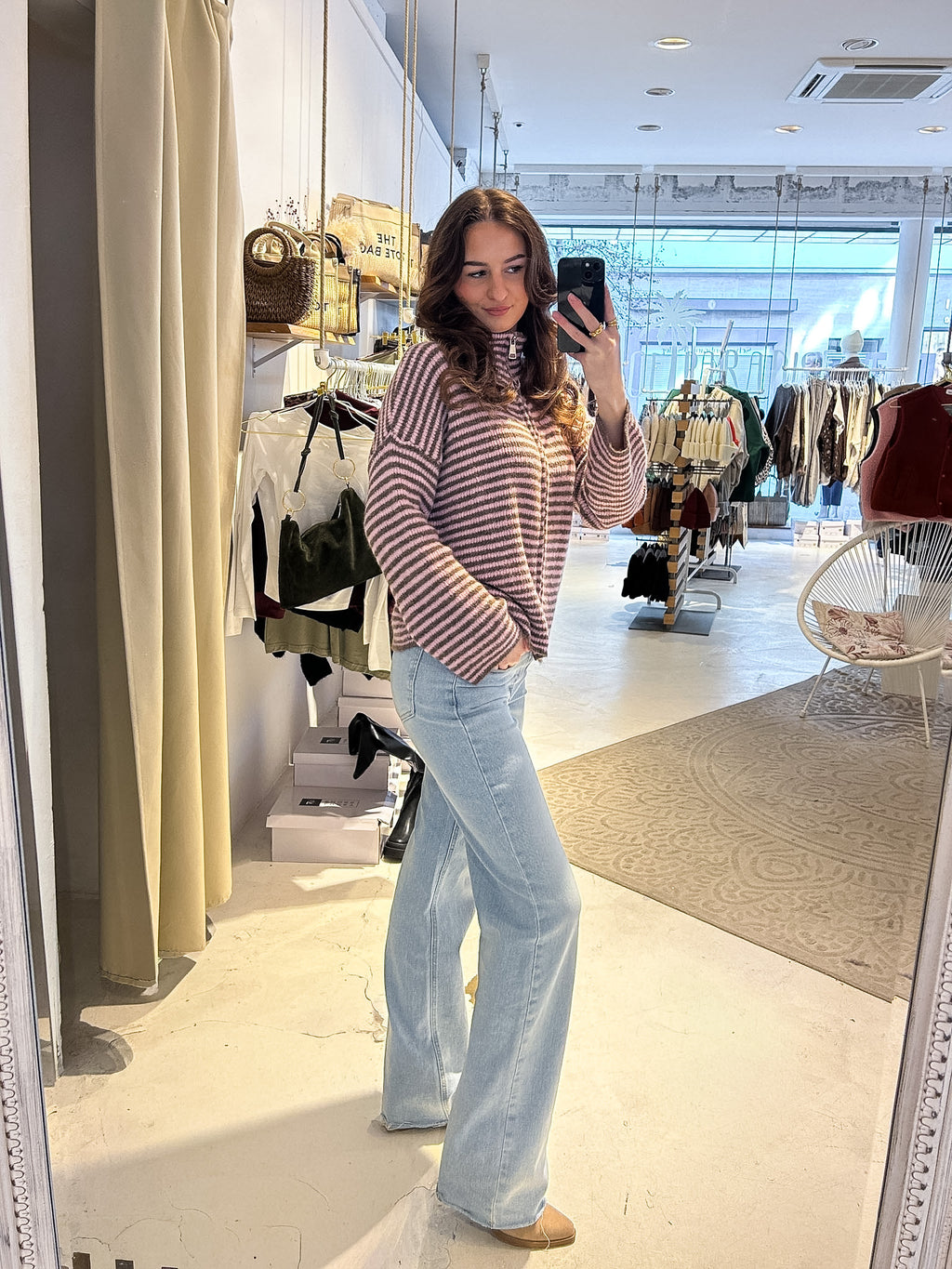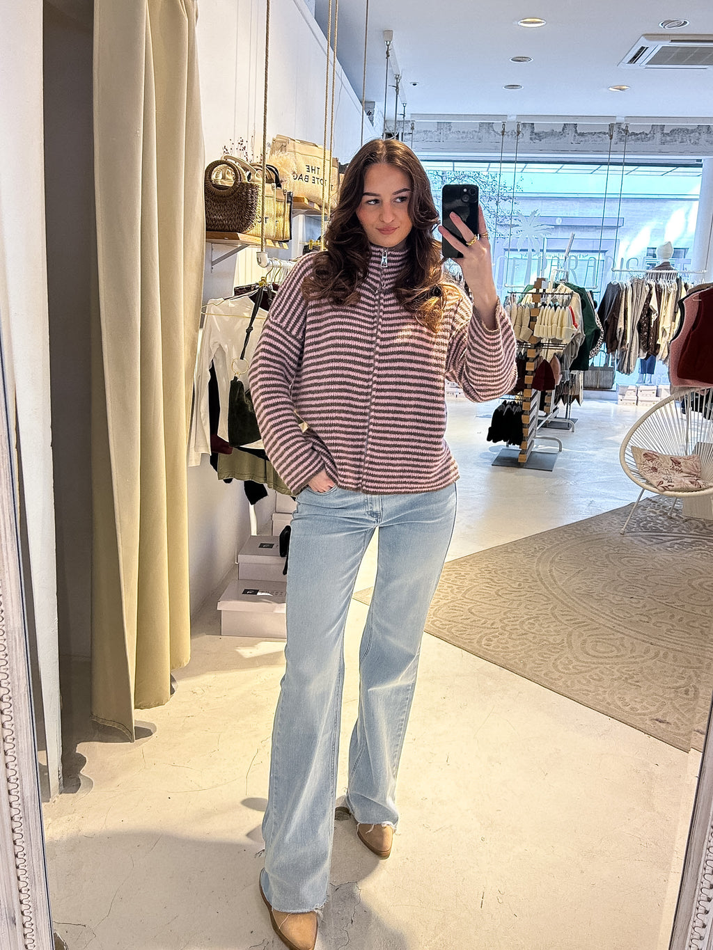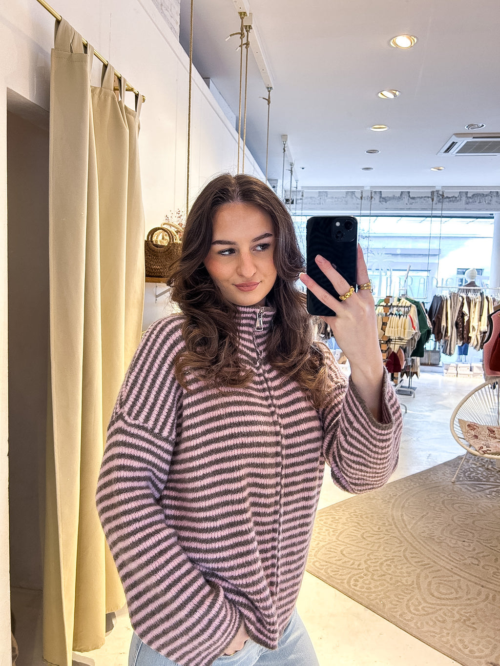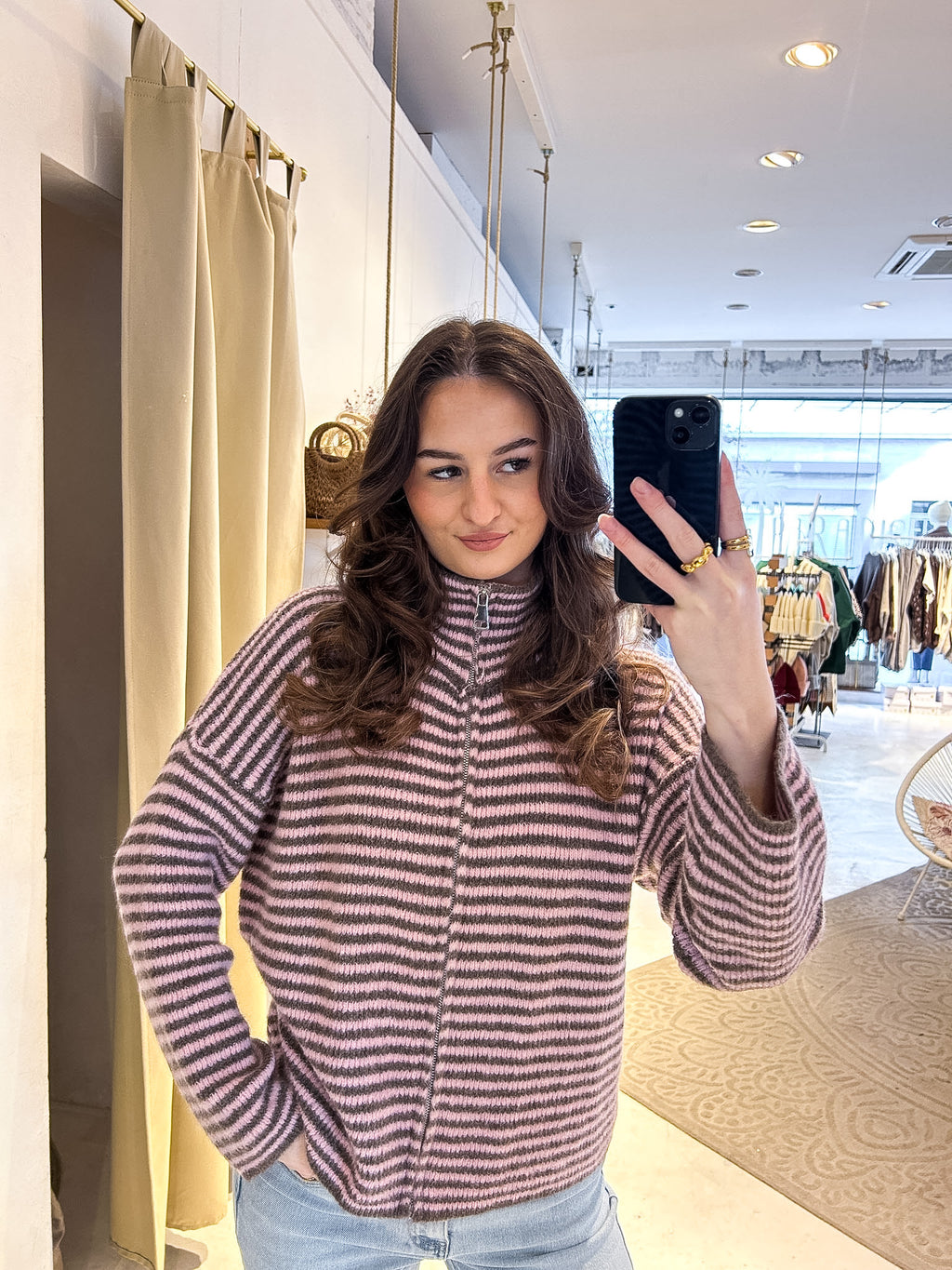 Strickjacke mit Zipper fein gestreift Braun/Rosa